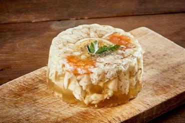 Elementy gotowanego kurczaka zatopione w galarecie z gotowaną marchewką oraz groszkiem.
