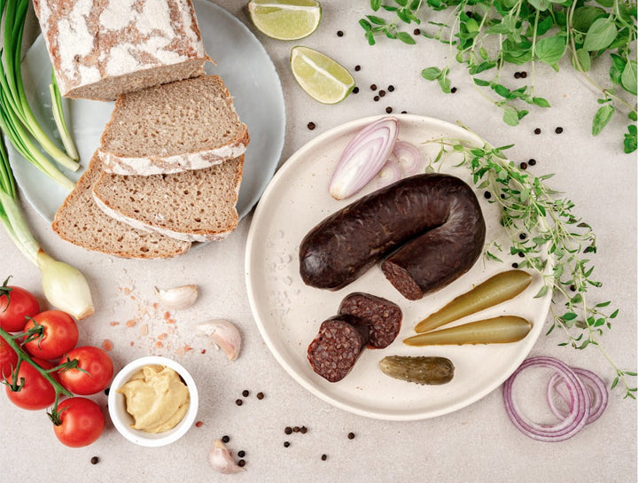 Składniki: Mięso wieprzowe EKO 38,9%, woda, kasza gryczana EKO, krew EKO, sól, przyprawy EKO, podroby wieprzowe gotowane EKO, skórki wieprzowe gotowane EKO, cebula suszona EKO, osłonka - jelito wieprzowe.