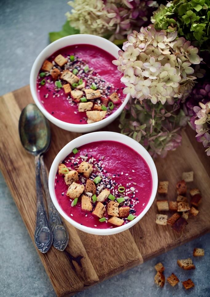 Aksamitny czerwony krem ze świeżych buraków to pyszny i zdrowy posiłek. Można jeść bez dodatków, ale idealnie będzie dodać do niego grzanki lub kawałki sera feta.
