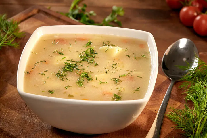 Składniki: bulion mięsno - warzywny, ziemniaki, marchew, pietruszka, mięso wieprzowe 7%, mięso z kurczaka 2%, koper, cebula, kasza jęczmienna ( gluten), przyprawy naturalne, (gorczyca, seler), sól spożywcza.