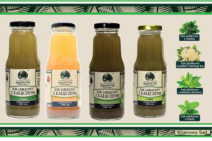 Mix "Ziołowo-Kwiatowy" to połączenie jabłek z miętą, melisą, werbeną cytrynową lub z sokiem z kwiatu czarnego bzu (12szt. x 300ml).