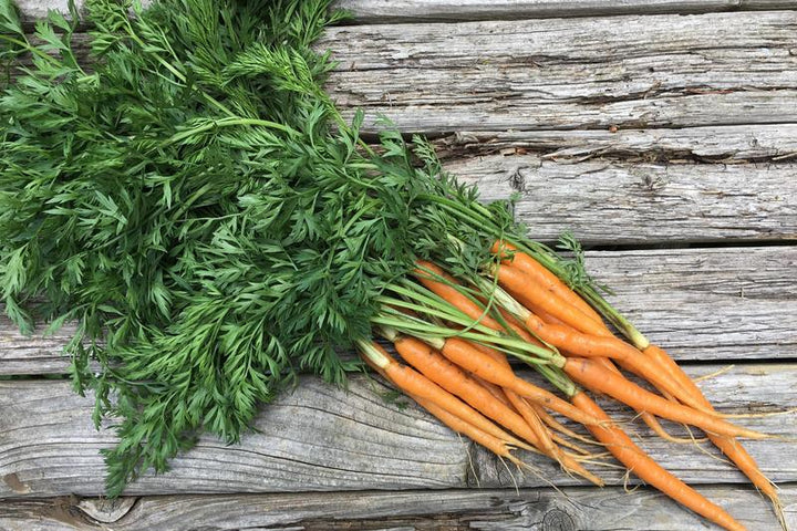 Bardzo młoda marchew z nacią, grubości długopisu.