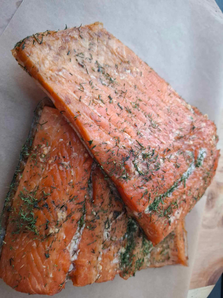 Płat z pstrąga wędzony na ciepło. /losowo-obsypany koperkiem lub suszonymi pomidorami/