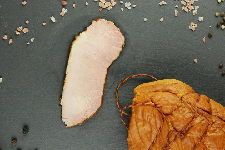 Szynka bez dodatków - tz. "E". Również bez soli peklującej zawierającej azotyn sodu - wyłącznie sól kuchenna. Szynka wędzona na naturalnym drewnie, soczysta i aromatyczna.