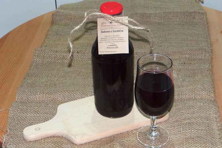 Zakwas z naturalnie kiszonych buraków w beczce z dodatkiem czosnku, chrzanu i kopru oraz bogatej w minerały soli kamiennej z kopalni w Kłodawie. Produkt niepasteryzowany.