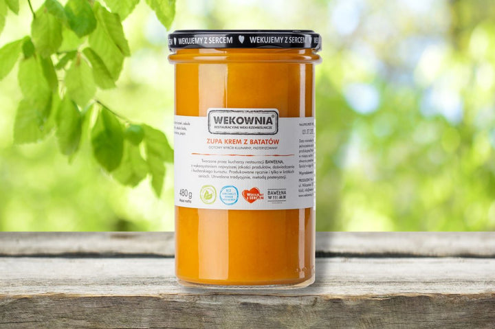 składniki: wywar z warzyw (woda, marchew, pietruszka korzeń, cebula biała), 20,7% batat (słodki ziemniak), pietruszka korzeń, cebula biała, marchew, masło (z mleka), sól, papryka wędzona mielona, pieprz cayenne, pieprz czarny